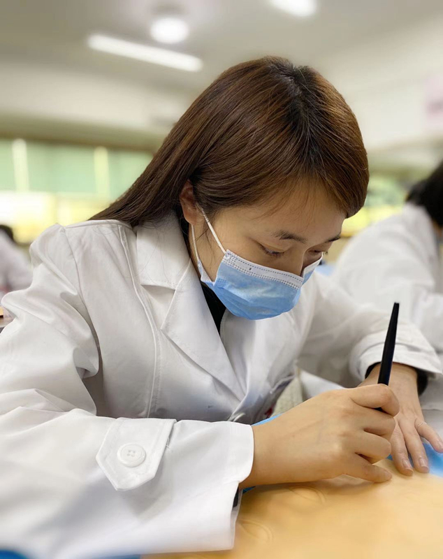 在下针时,力度要适当,因为纹眉是通过针法的运用刺到表皮层,非用力向下刺,不是力量越大越易上色。并且上色的情况与针和笔的角度有关系,手工笔就可以拿来确定操作时出针的角度以及下手所用力度。